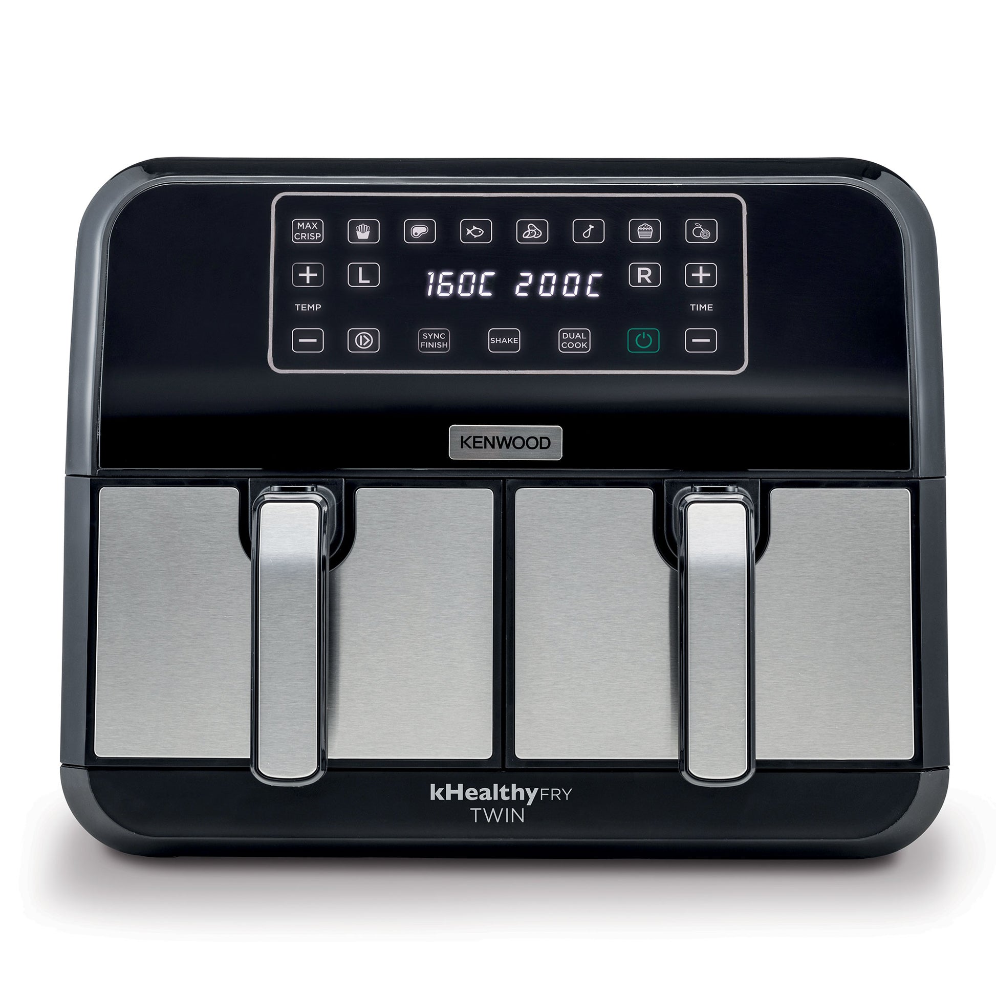 Sleek black and silver finish for modern kitchens; two-basket design helps prepare mains and sides at once.