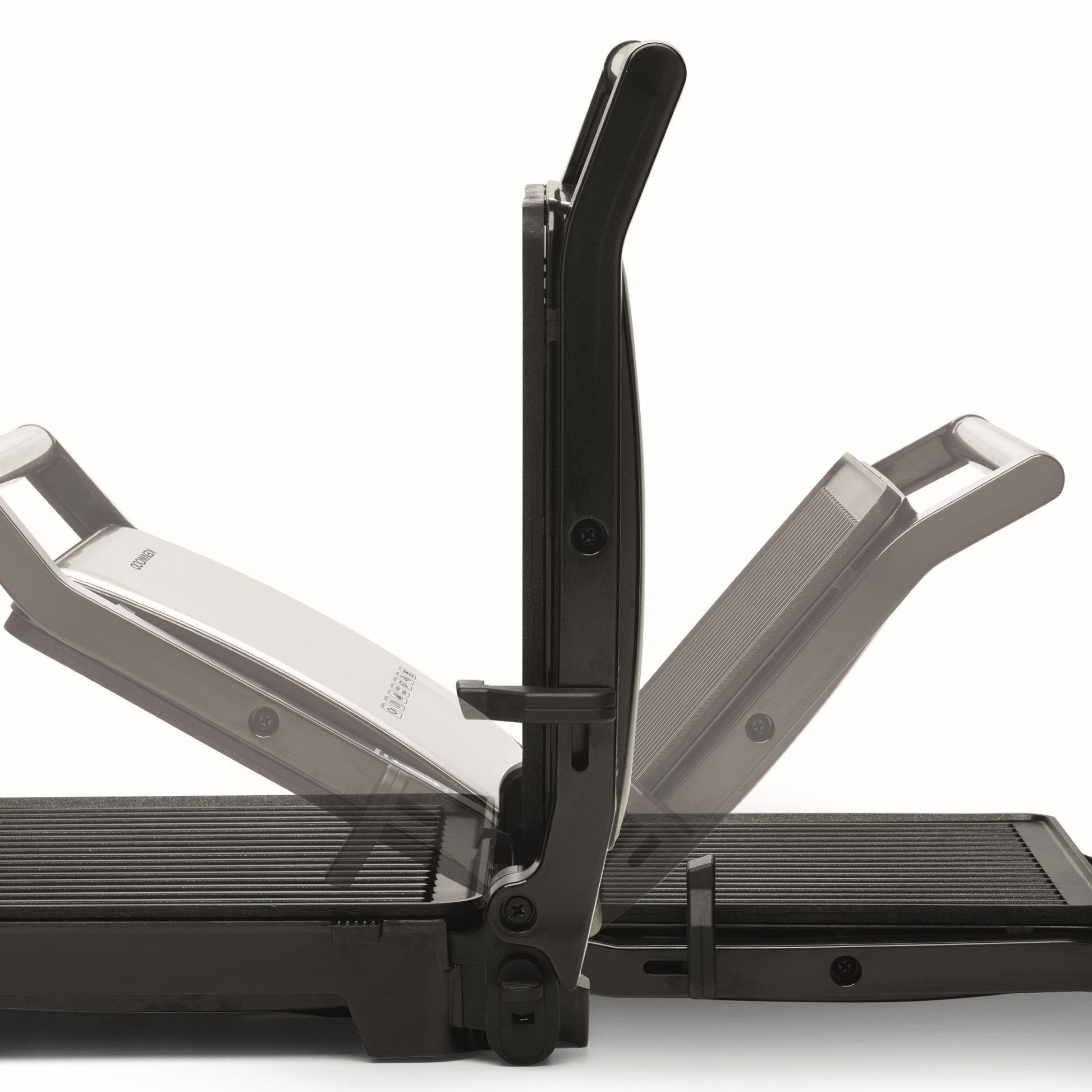 Three adjustable grill positions for different cooking styles — flat open grill, panini press, full contact press.